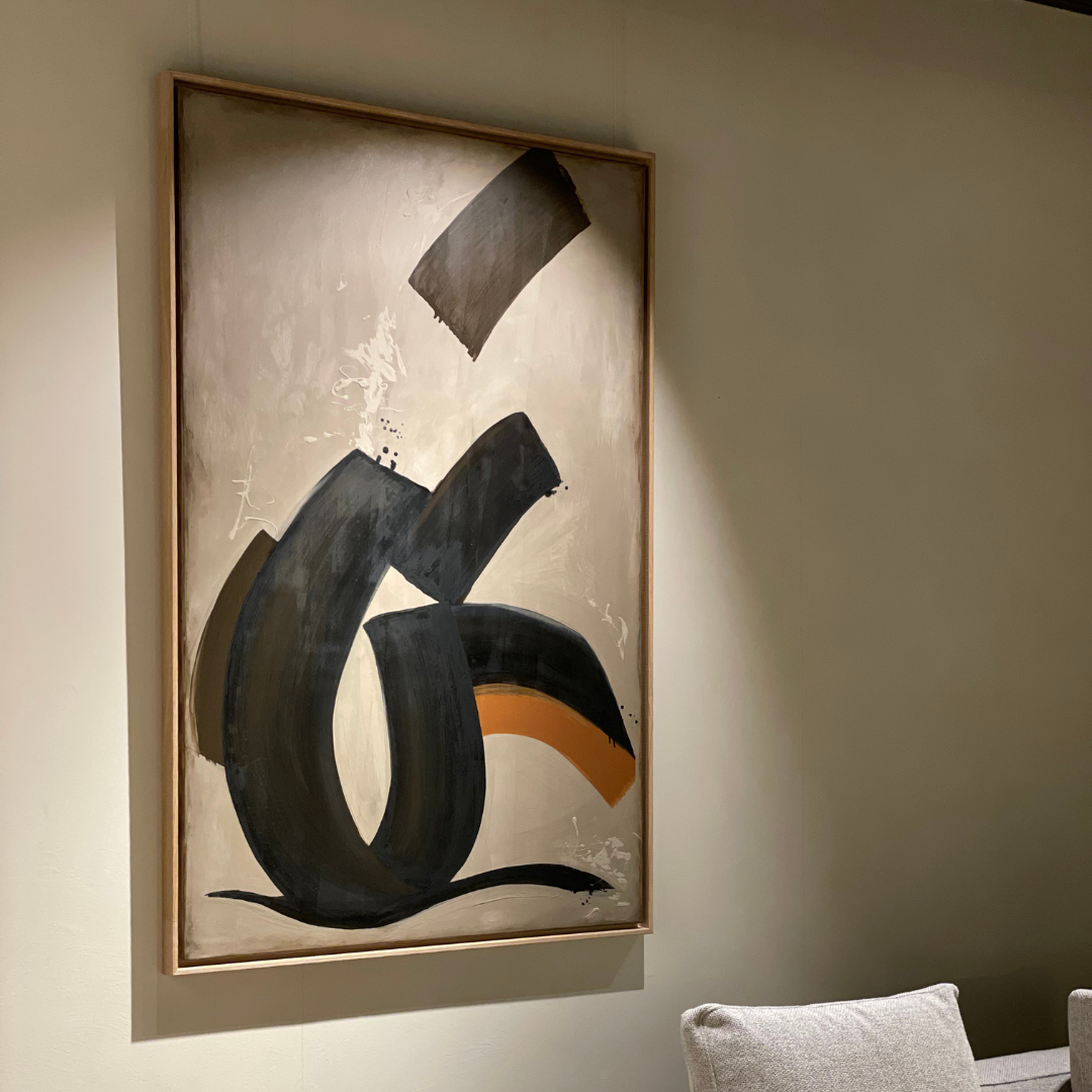 Dit artistieke canvas is een krachtige uiting van abstracte vormen in zwart, beige en subtiel oranje. Met een afmeting van 100×150 cm straalt dit werk een eigentijdse en dynamische energie uit, perfect om elke ruimte een gedurfd karakter te geven. De natuurlijke houtkleurige baklijst, voorzien van zichtbare houtnerf, omkadert het werk op elegante wijze en versterkt de moderne uitstraling.